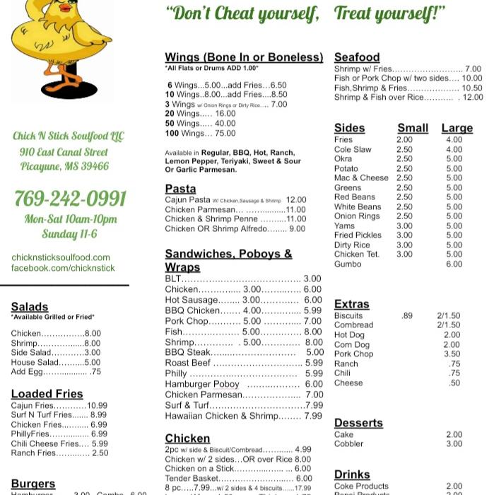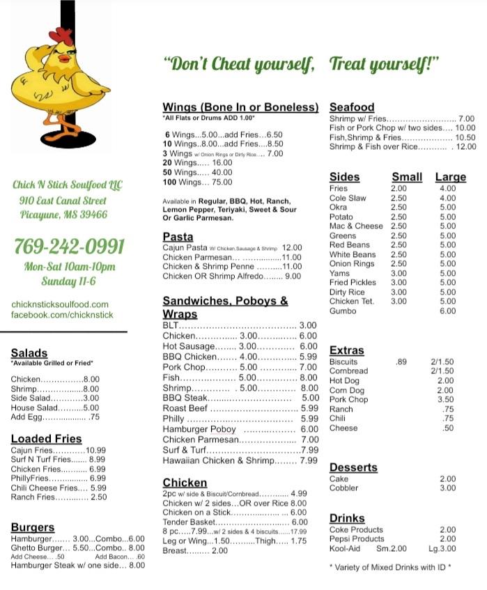 Welcome to Chick N Stick Soulfood, your ultimate destination for Southern cuisine in a family-friendly atmosphere. Located at 1111 Memorial Blvd, Picayune, MS, we offer a vibrant setting complete with plenty of seating, multiple televisions for sports enthusiasts, and a pool table for leisurely fun. Join us for live entertainment on our stage, or simply relax and enjoy our delicious menu featuring classic Southern specialties. As a proud Black-owned and veteran-operated establishment, we provide a range of services including outdoor seating, contactless delivery, and a special happy hour. Treat yourself to a memorable dining experience at Chick N Stick!
